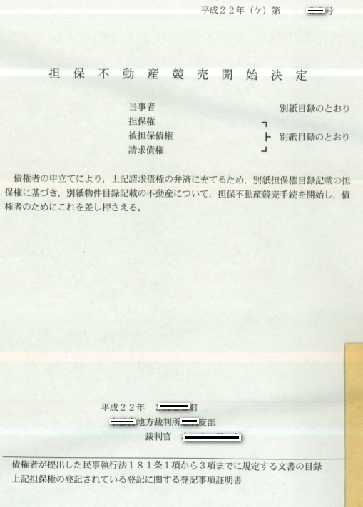 住宅ローン及び、不動産担保ローンの支払いを滞納すると、債権者は残債務を回収すべく、不動産を裁判所に申し立て競売にかけるべく、差し押さえを行います。この場合「担保不動産競売開始決定」と言う通知が裁判所より届き、事件番号は平成00年(ケ)0000号と記載されます。